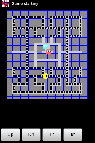 This is a basic implementation ported from JGameGrid (see here for further information) to keep the code simple for the purpose of demonstration. There are only two ghosts with a simple strategy: One ghost moves arbitrarily through the maze but may block the Pac-Man to move. The other ghost knows the position of the Pac-Man and moves toward him.