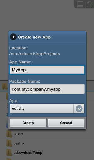 Create an Android project with AIDE. You may adopt the default project settings:
