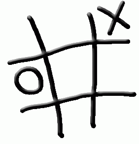 A simple game in which one player marks down only crosses and another only ciphers [zeroes], each alternating in filling in marks in any of the nine compartments of a figure formed by two vertical lines crossed by two horizontal lines, the winner being the first to fill in three of his marks in any row or diagonal.